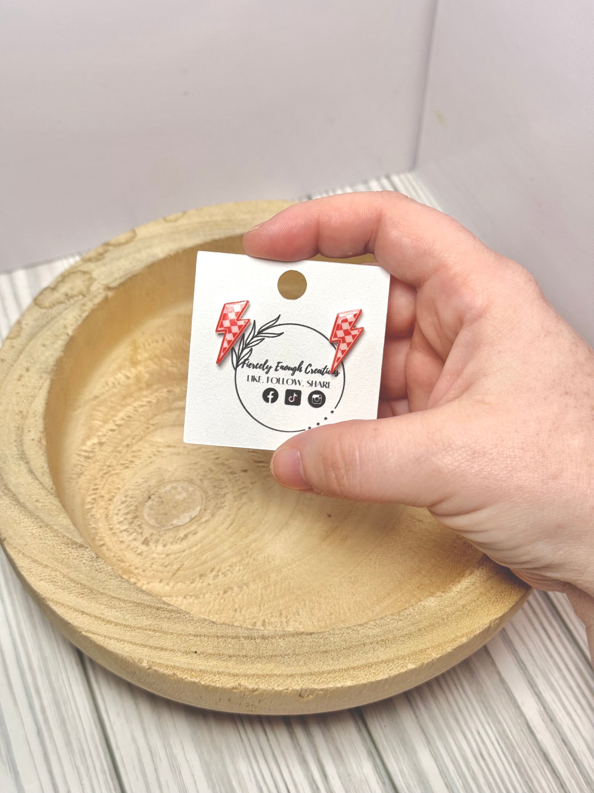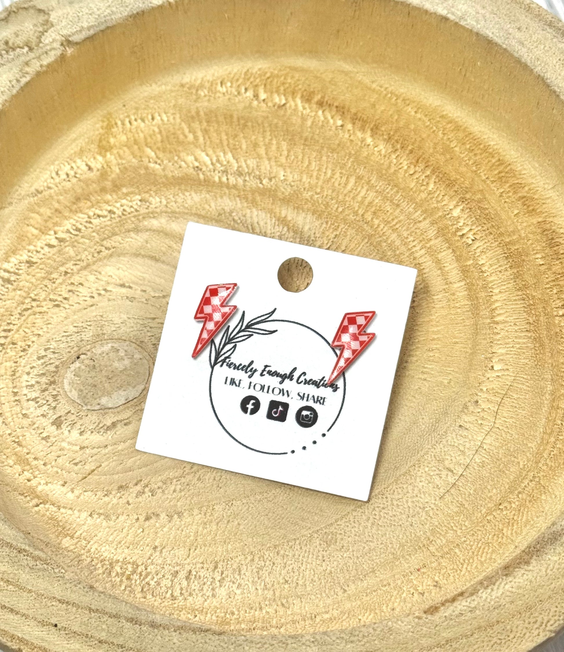 These handmade clay earrings feature a dynamic checkered lightning bolt design, perfect for adding a bold touch to any outfit. Lightweight and hypoallergenic, they offer comfortable all-day wear without irritation. Showcase your unique style with these eye-catching, football-inspired accessories that blend fun and fashion effortlessly.