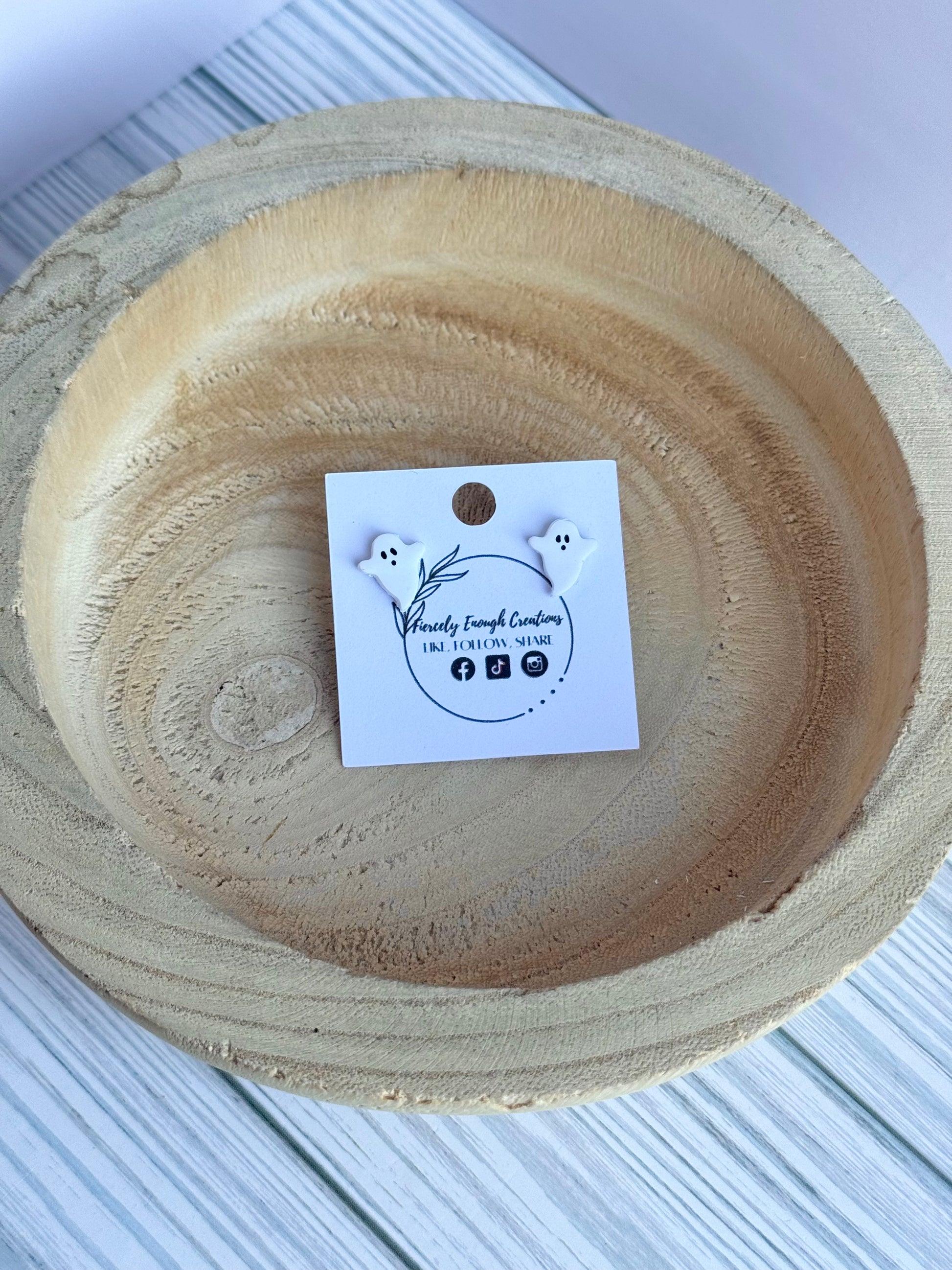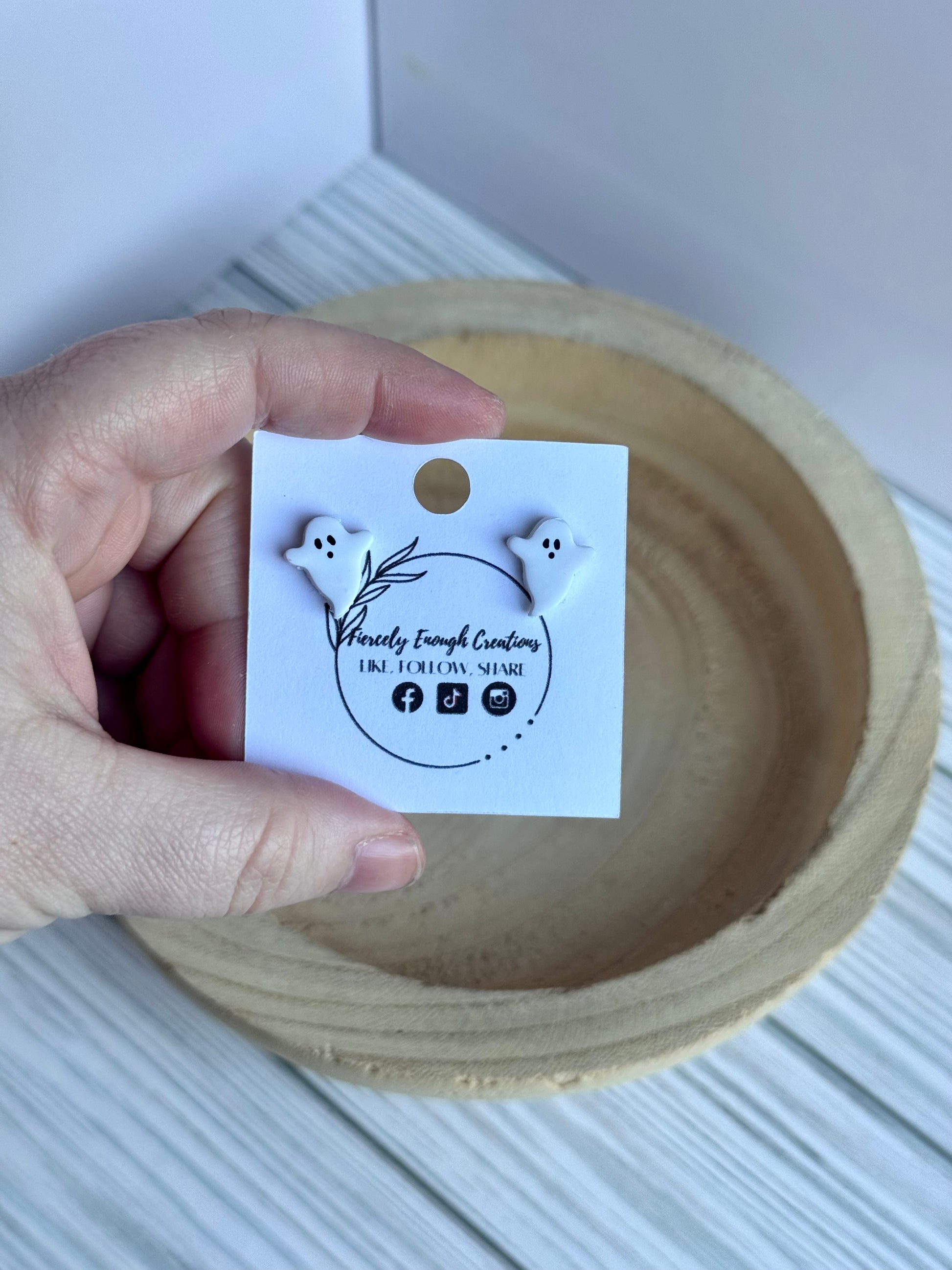 Celebrate the spookiest season with these Ghost Studs, handmade from lightweight, hypoallergenic clay for all-day comfort. Perfect for fall and Halloween, these delicate earrings add a subtle, festive touch without weighing you down or irritating your skin. Embrace the spirit of the season with style that’s both charming and comfortable.