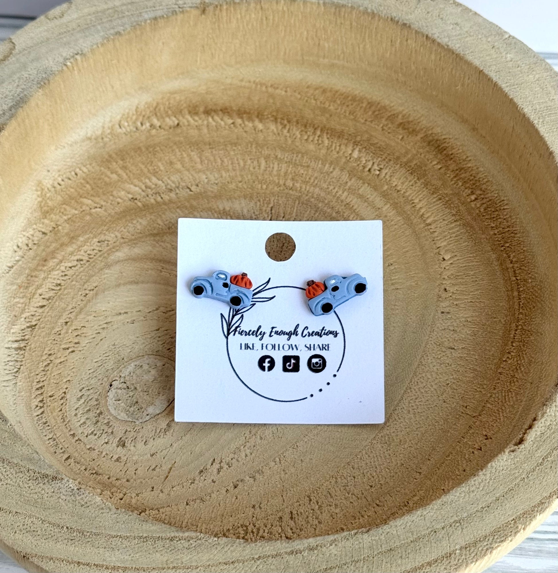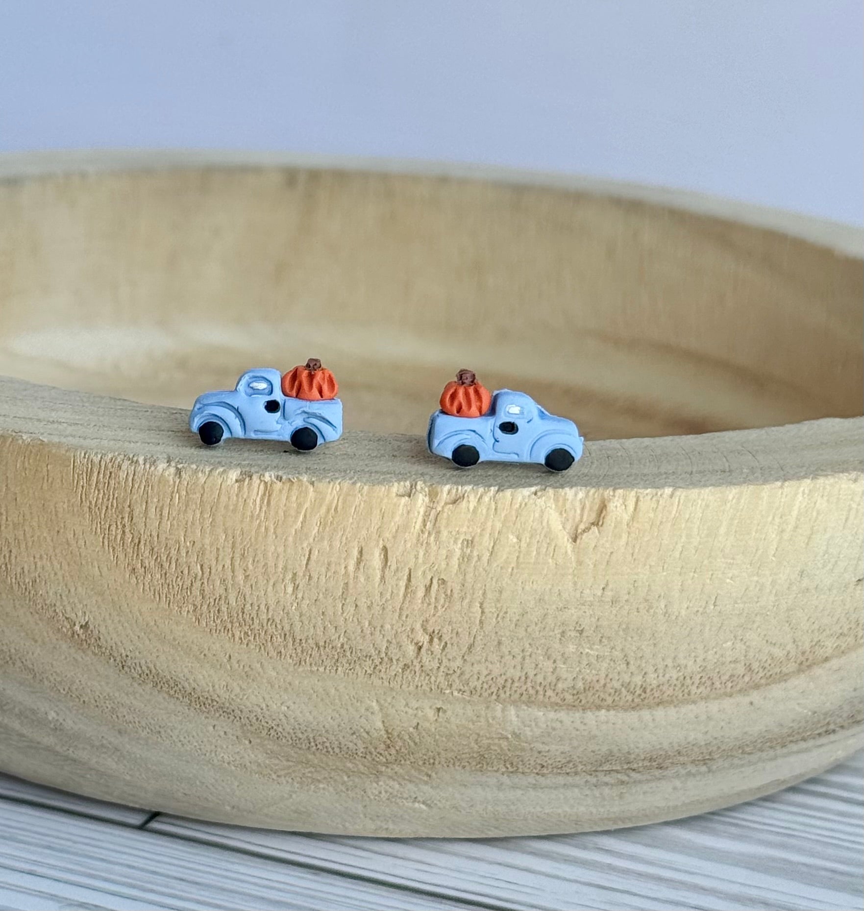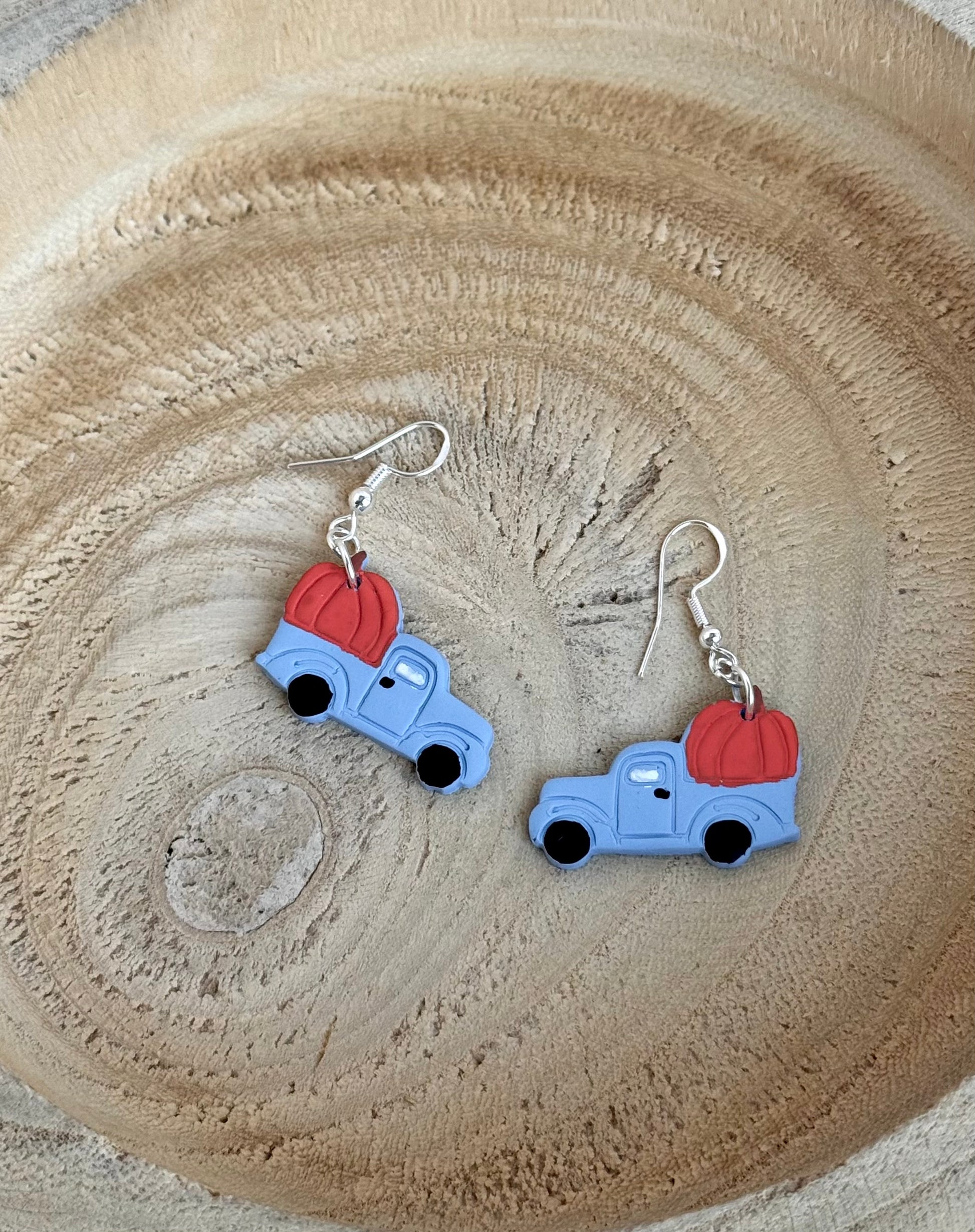 Celebrate fall with these handmade clay earrings, featuring a delightful pumpkin truck design. Hypoallergenic and lightweight, they ensure comfortable wear for sensitive ears while adding a festive, seasonal charm to your look. Perfect for embracing fall’s cozy vibes with style and ease.