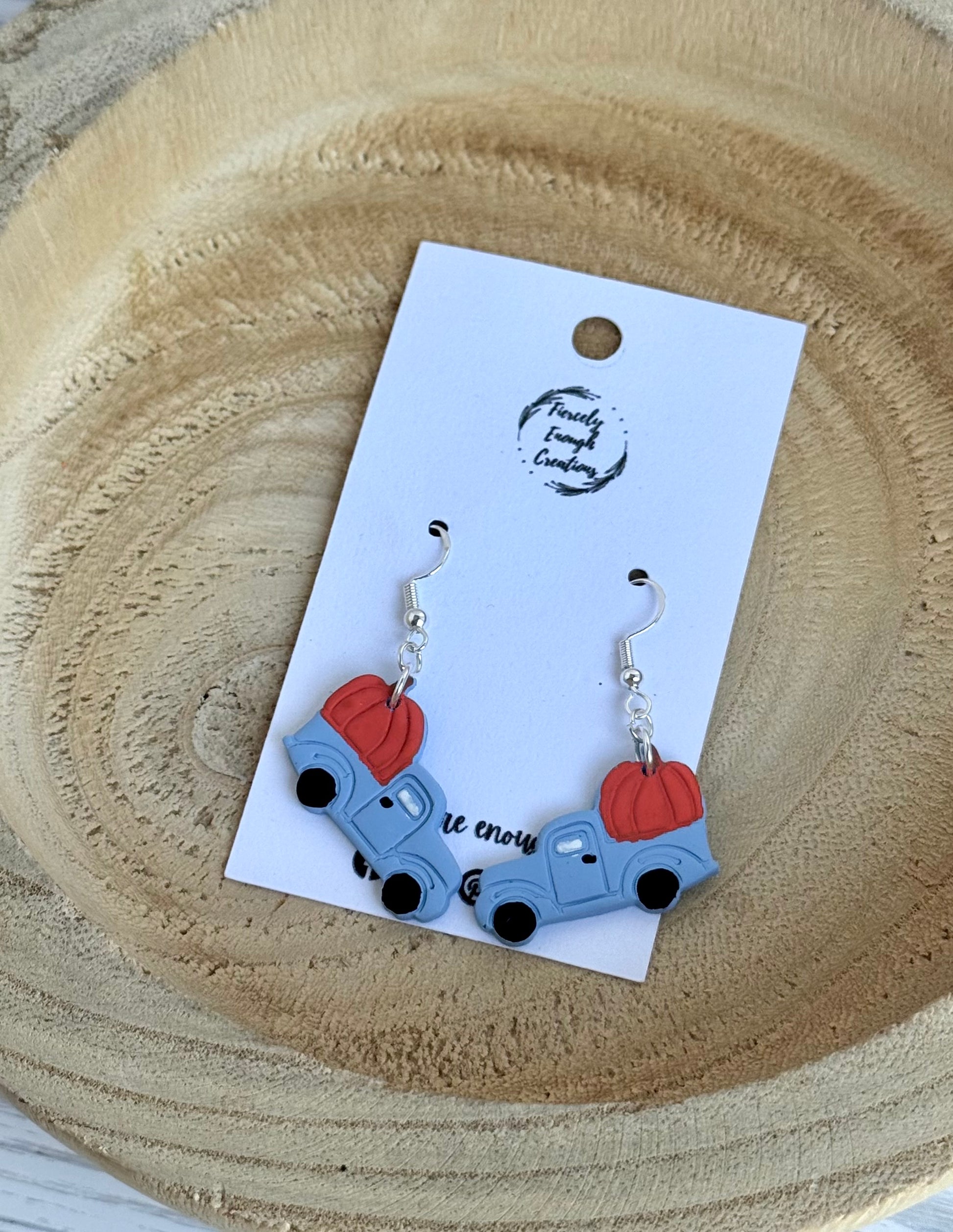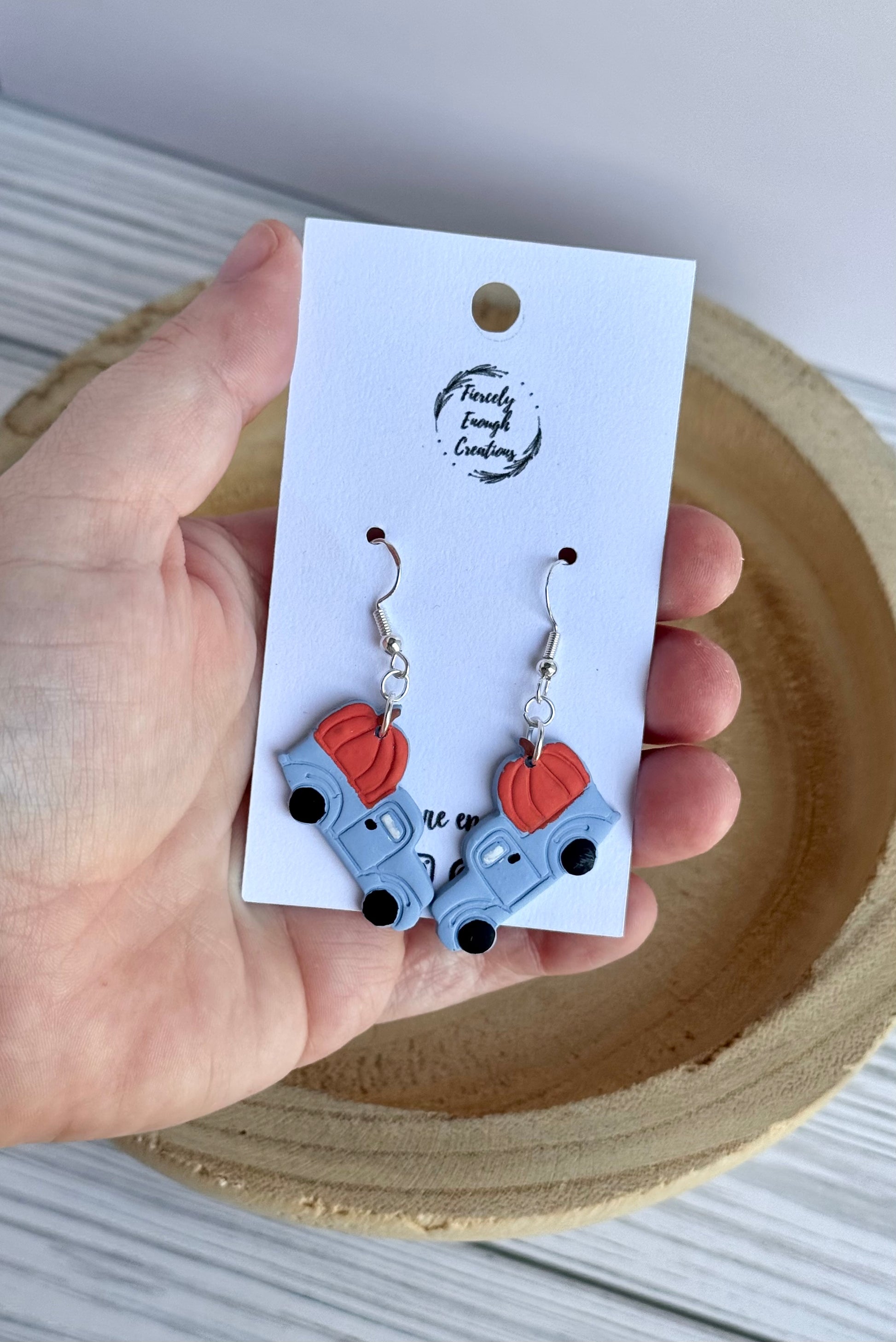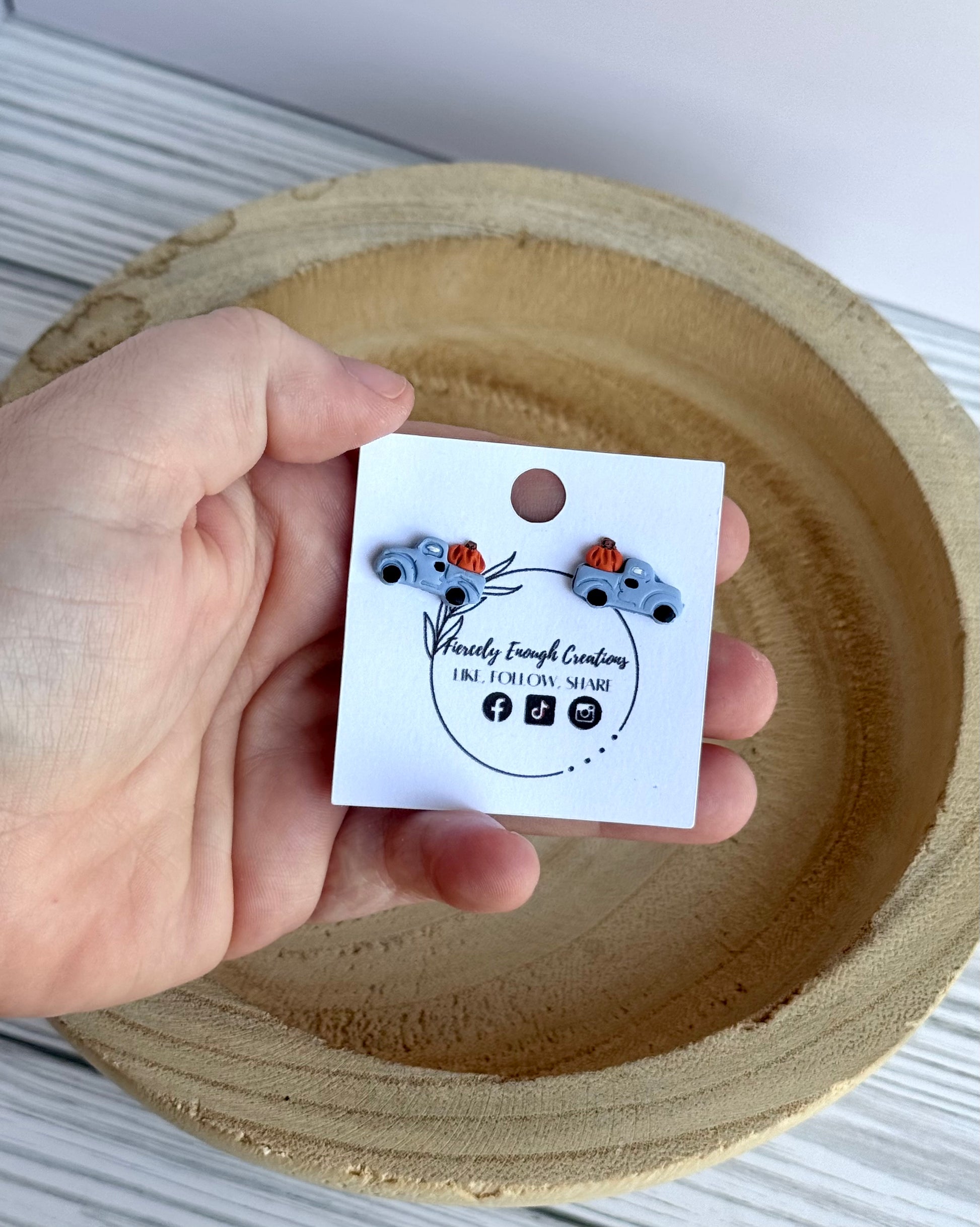 Celebrate fall with these handmade clay earrings, featuring a delightful pumpkin truck design. Hypoallergenic and lightweight, they ensure comfortable wear for sensitive ears while adding a festive, seasonal charm to your look. Perfect for embracing fall’s cozy vibes with style and ease.